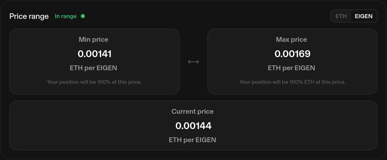 You initially invested 3 WETH (Wrapped Ethereum) and 0 EIGEN. This means that at the start, you only used WETH to enter the position and had no EIGEN tokens.Current Assets: 2.23 WETH - 460 EIGEN